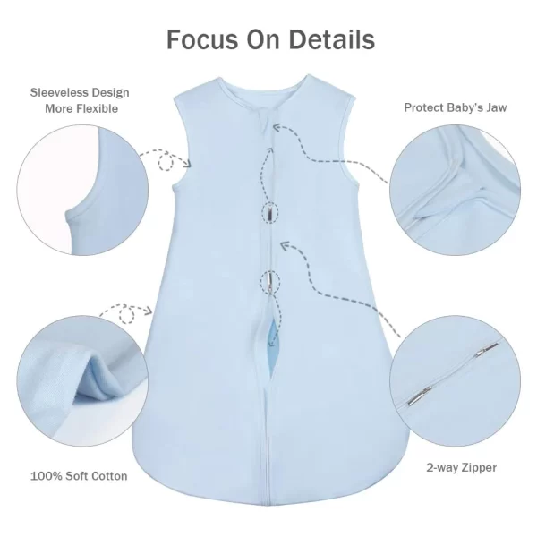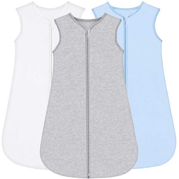 The baby sleep sack set comes with 3 pack of difference color (Blue, Grey, White). These unisex colors suit both baby boys&girls well. And 3 pack baby sleep sacks make it easier for you to change and clean up.